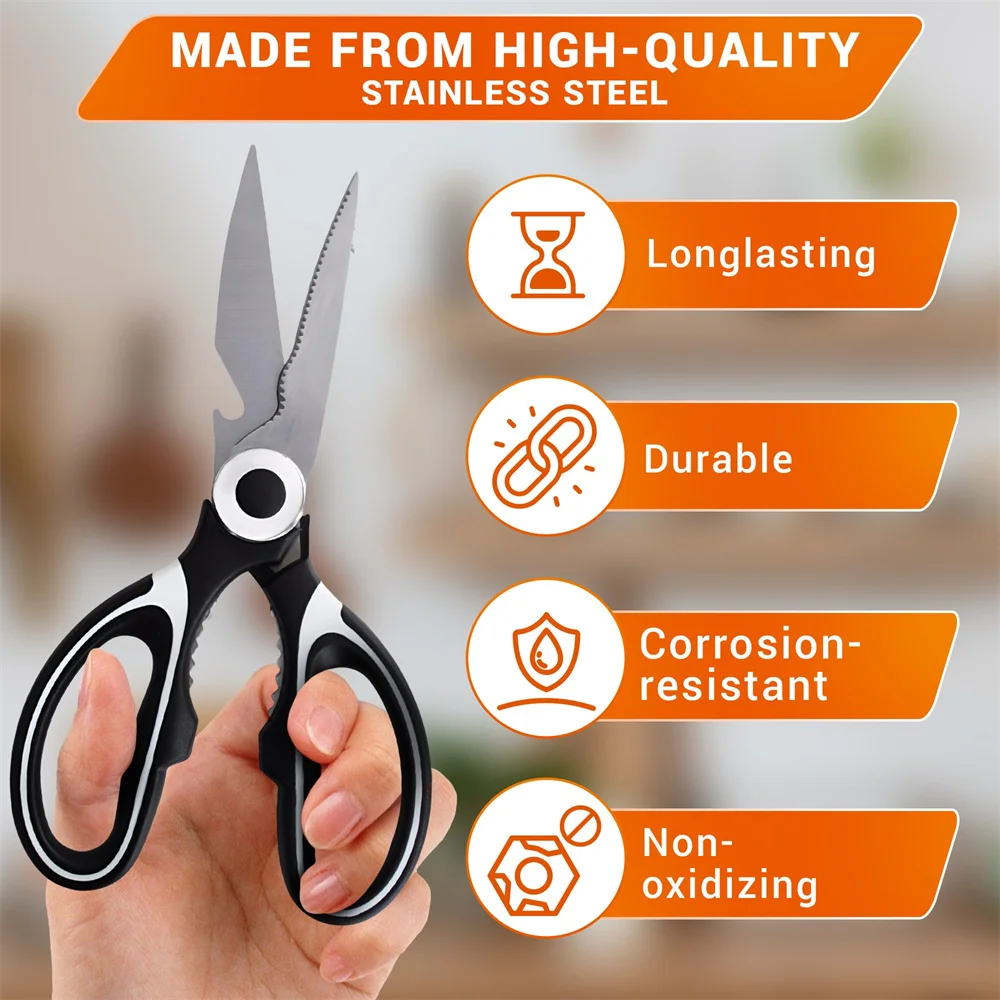 Corrosion Resistant Meat Scissors: Our kitchen scissors heavy duty shears are made of high quality updated 2CR13 stainless steel. This kitchen shear is durable with better rust prevention and stronger corrosion resistance
